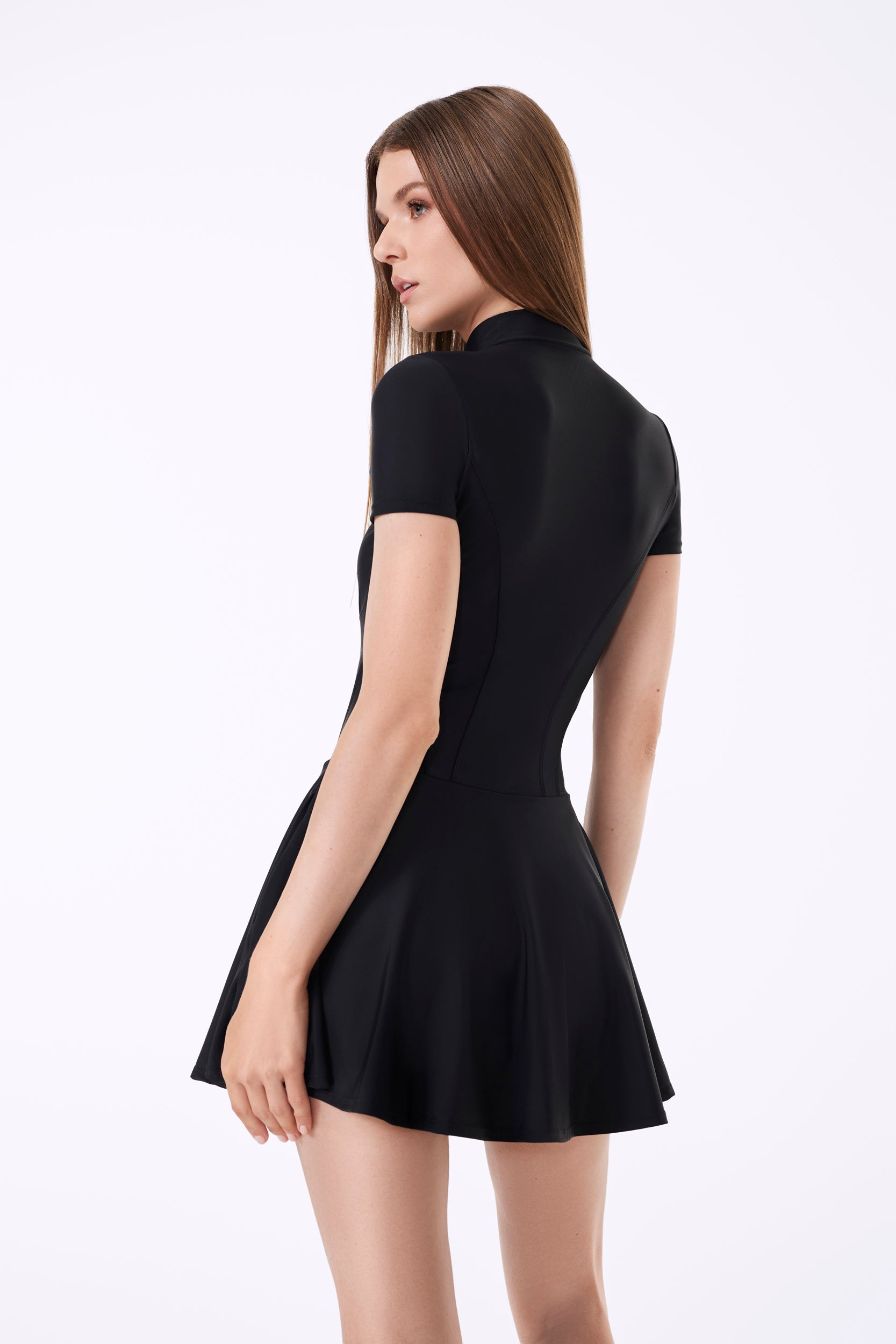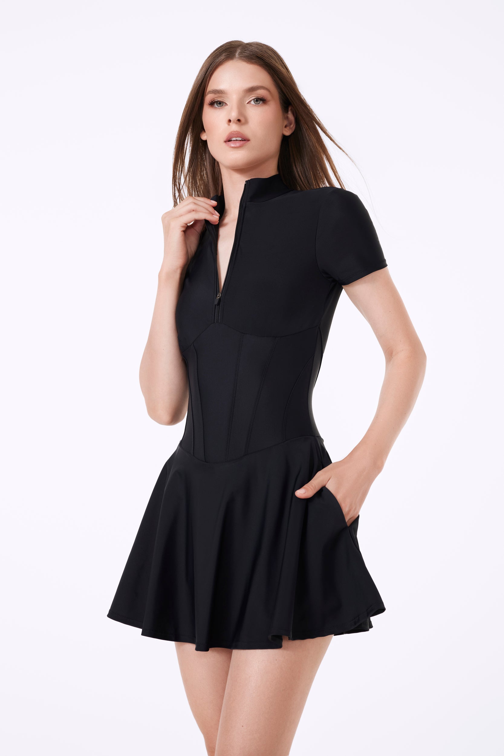 The Vienna Dress is a timeless take on sport-luxury - sleek, sculpted & designed for athletes who prefer a more covered, refined look. With filled-in corset-inspired paneling, a zip-up or down front & a slightly longer hemline, it brings effortless class to any court or clubhouse. Built-in shorts, discreet ball pockets, & a structured silhouette make this a go-to for movement without compromise.