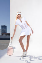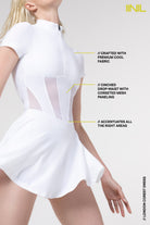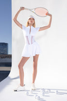 The London Corset Dress is designed to make an entrance - on the court & beyond. With signature corset mesh paneling & a cinched, dropped waist, it creates a flattering, sculpted, zip-up or down silhouette that turns heads wherever you go. From match to city streets, this dress does it all.