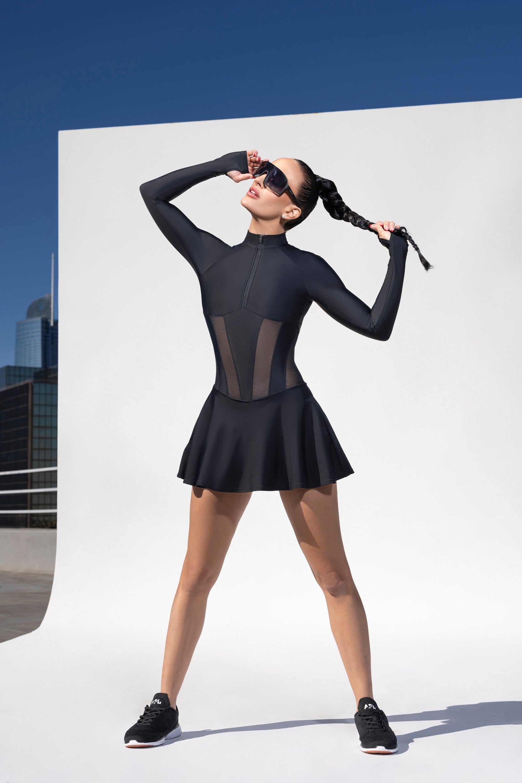 The Los Angeles Long Sleeve Dress blends sport-luxury with a bold, modern edge. With signature mesh corset paneling & long sleeves finished with thumb holes, this piece transitions effortlessly from court to city. A zip-up or down front, sculpted silhouette & performance details make it the perfect all-day, all-season statement.