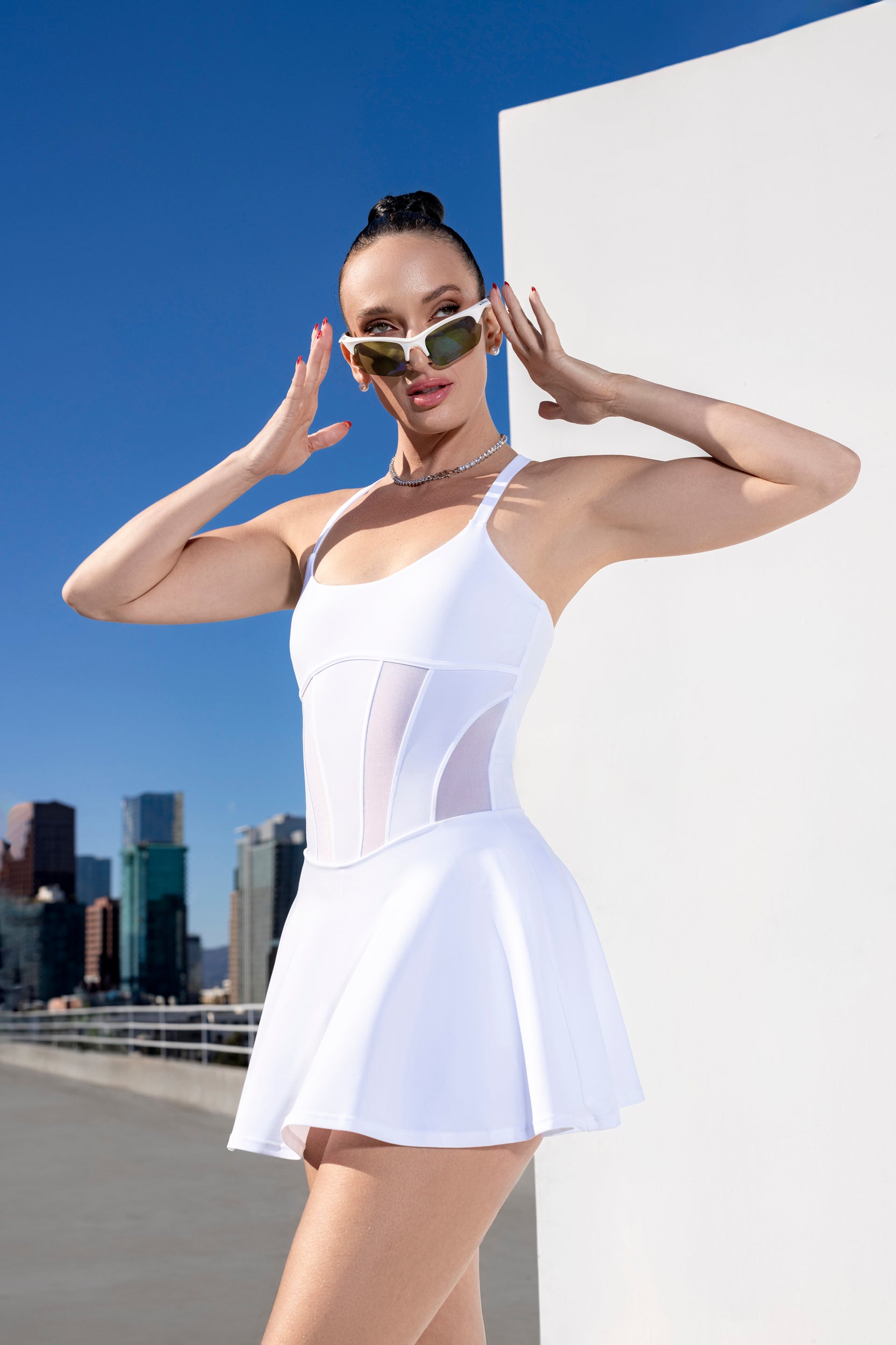 The Tokyo Tank Corset Dress is your year-round statement piece - sleek, sculpted & made to move. With a sleeveless silhouette, criss-cross back straps & sheer mesh corset paneling, this dress brings an elevated edge to every game, match or outing. Crafted from cool-touch fabric & finished with functional details like side pockets & built-in shorts, it’s made to perform in the heat - without sacrificing style.